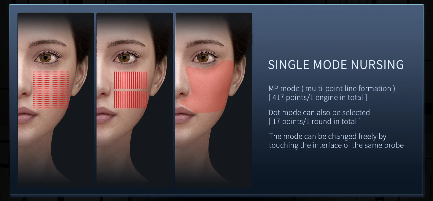 1.Unique instrument and handle appearance original patent design. High-frequency brushless motor folding linkage work, efficient operation, to ensure that the operation enjoys silky smooth. 2.Three groups of power management module 1280 watts of high-power output, so that ultra sound in a very short period of time to effectively reduce the operating area energy density, so that the heat effect is more uniform and gentle. 3.2 M / 4 M / 5.5 M three probe frequency and seven probe models on the point, surface, line and skin layer by layer, so that the energy in a very short period of time to release the extreme peak value of energy on the point, surface, line and skin layer by layer, the limit to shorten the operating time. 4.The new dynamic intelligent UI interface design, dual handle at the same time synergistic operation, so as to realize the use of 1 +1 greater than 2 experience. 5.NP mode pulse energy output increased to 0.38 ms, linear mode breakthrough 618 points. 6.The left and right handles can choose point and NP linear two modes to switch each other synchronized output, to the operator to bring more simple, easy, pleasant experience. 7.13.3 inch smart screen, User-friendly operation, making the operation easy and fast.